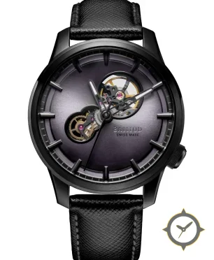 Eine Skelett-Uhr mit einem markanten 49.5mm Auftritt am Handgelenk, gefertigt aus Edelstahl mit einem Zifferblatt in lila und einer besonderen "fumé / sunburst gradient"-Oberfläche.