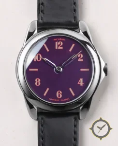 Eine Dress-Uhr mit einem 37.5mm Gehäuse im Vintage-Stil gefertigt aus Edelstahl mit einem Zifferblatt in lila und einer besonderen "vitreous enamel"-Oberfläche.