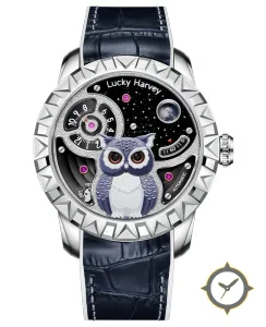 Eine Luxus-Uhr mit einem 37mm Gehäuse im Vintage-Stil gefertigt aus Edelstahl mit einem Zifferblatt in schwarz und einer besonderen "starry/engraved with applied enamel owl motif"-Oberfläche und einer wunderschönen Mondphasenanzeige.