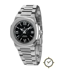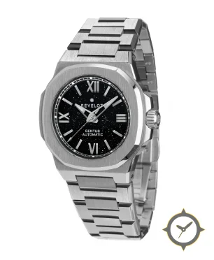 Eine Sport-Uhr mit einem vielseitigen 38mm Gehäuse, das an fast jedes Handgelenk passt, gefertigt aus Edelstahl mit einem Zifferblatt in schwarz und einer besonderen "aventurine-like sparkling (starfield)"-Oberfläche.