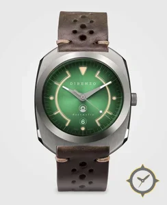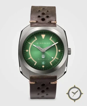 Eine Vintage-Uhr mit einem 33.5mm Gehäuse im Vintage-Stil gefertigt aus Edelstahl mit einem Zifferblatt in grün und einer besonderen "radial sunburst (fumé)"-Oberfläche.