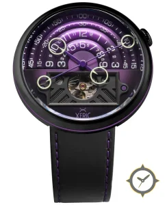 Eine Skelett-Uhr mit einem markanten 51.5mm Auftritt am Handgelenk, gefertigt aus Edelstahl mit einem Zifferblatt in lila und einer besonderen "concentric stepped rings with a subtle metallic/sunburst finish"-Oberfläche.