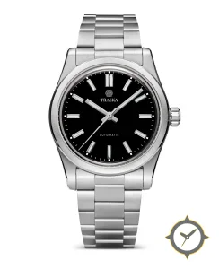 Eine Sport-Uhr mit einem vielseitigen 38mm Gehäuse, das an fast jedes Handgelenk passt, gefertigt aus Edelstahl mit einem Zifferblatt in schwarz und einer besonderen "glossy"-Oberfläche.