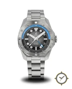 Eine GMT-Uhr mit einem markanten 44mm Auftritt am Handgelenk, gefertigt aus Edelstahl mit einem Zifferblatt in grau und einer besonderen "matte with subtle gradient/fumé effect"-Oberfläche und einer echten GMT-Funktion, mit der du eine zweite Zeitzone verfolgen kannst.