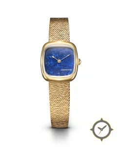 Eine Dress-Uhr mit einem 33mm Gehäuse im Vintage-Stil gefertigt aus Gold mit einem Zifferblatt in blau und einer besonderen "lapis-lazuli stone texture"-Oberfläche.