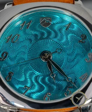 Eine Dress-Uhr gefertigt aus Edelstahl mit einem Zifferblatt in türkis und einer besonderen "guilloché (engine-turned) wave texture"-Oberfläche.