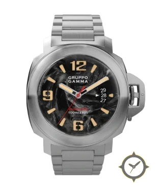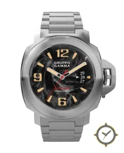 Eine Militär-Uhr mit einem markanten 42.5mm Auftritt am Handgelenk, gefertigt aus Edelstahl mit einem Zifferblatt in schwarz und einer besonderen "marble/swirl effect"-Oberfläche.