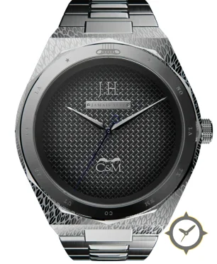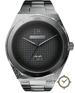 Eine Luxus-Uhr mit einem vielseitigen 39.5mm Gehäuse, das an fast jedes Handgelenk passt, gefertigt aus Edelstahl mit einem Zifferblatt in schwarz und einer besonderen "woven / stamped lattice guilloché (textured grid)"-Oberfläche.
