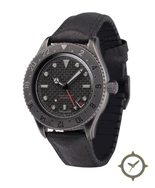 Eine GMT-Uhr mit einem 34.5mm Gehäuse im Vintage-Stil gefertigt aus Edelstahl mit einem Zifferblatt in schwarz und einer besonderen "carbon fiber weave"-Oberfläche und einer echten GMT-Funktion, mit der du eine zweite Zeitzone verfolgen kannst.
