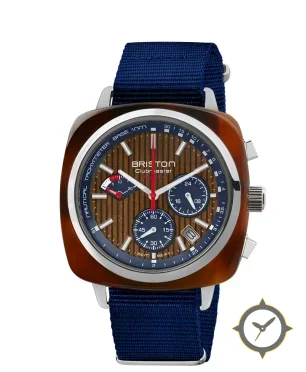 Eine Chronograph-Uhr mit einem markanten 48mm Auftritt am Handgelenk, gefertigt aus Harz mit einem Zifferblatt in braun und einer besonderen "teak wood texture (vertical stripes)"-Oberfläche.
