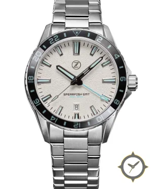 Eine GMT-Uhr mit einem vielseitigen 41mm Gehäuse, das an fast jedes Handgelenk passt, gefertigt aus Edelstahl mit einem Zifferblatt in weiß und einer besonderen "textured/grained (radial bark-like texture)"-Oberfläche und einer echten GMT-Funktion, mit der du eine zweite Zeitzone verfolgen kannst.