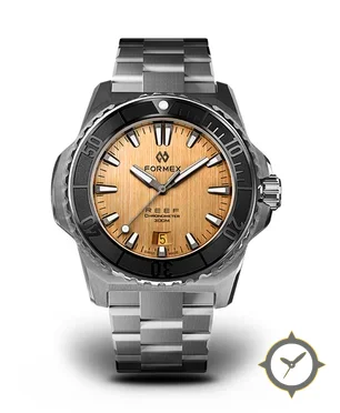 Eine Taucheruhr-Uhr mit einem markanten 44mm Auftritt am Handgelenk, gefertigt aus Edelstahl mit einem Zifferblatt in gold und einer besonderen "vertical brushed / woodgrain finish"-Oberfläche.