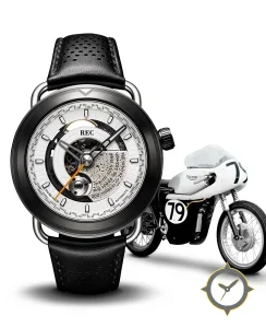 Eine Skelett-Uhr mit einem 36mm Gehäuse im Vintage-Stil gefertigt aus Edelstahl mit einem Zifferblatt in weiß und einer besonderen "partially skeletonized / open-work with textured metal insert"-Oberfläche.