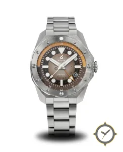 Eine GMT-Uhr mit einem markanten 41.5mm Auftritt am Handgelenk, gefertigt aus Edelstahl mit einem Zifferblatt in braun und einer besonderen "gradient (fumé)"-Oberfläche und einer echten GMT-Funktion, mit der du eine zweite Zeitzone verfolgen kannst.