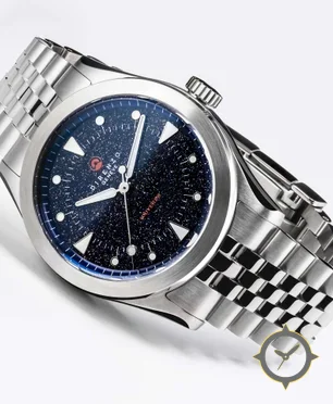 Eine Sport-Uhr mit einem 35.5mm Gehäuse im Vintage-Stil gefertigt aus Edelstahl mit einem Zifferblatt in blau und einer besonderen "aventurine (sparkling)"-Oberfläche.