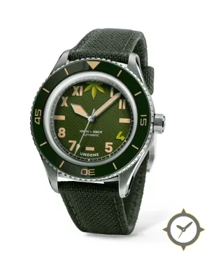 Eine Taucheruhr-Uhr mit einem markanten 45.5mm Auftritt am Handgelenk, gefertigt aus Edelstahl mit einem Zifferblatt in grün und einer besonderen "crosshatch"-Oberfläche.