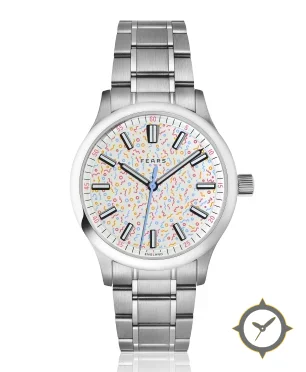 Eine Minimalistisch-Uhr mit einem vielseitigen 39.5mm Gehäuse, das an fast jedes Handgelenk passt, gefertigt aus Edelstahl mit einem Zifferblatt in weiß und einer besonderen "printed multicolor confetti"-Oberfläche.