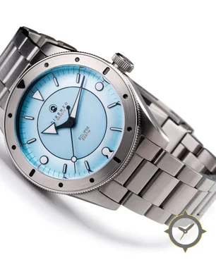 Eine Taucheruhr-Uhr mit einem markanten 43mm Auftritt am Handgelenk, gefertigt aus Edelstahl mit einem Zifferblatt in blau und einer besonderen "gradient (light center to darker edge)"-Oberfläche.