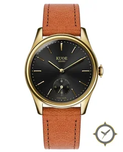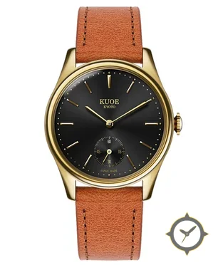 Eine Dress-Uhr mit einem 32.5mm Gehäuse im Vintage-Stil gefertigt aus Gold mit einem Zifferblatt in schwarz und einer besonderen "sunburst"-Oberfläche.