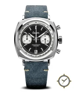 Eine Chronograph-Uhr mit einem markanten 41.5mm Auftritt am Handgelenk, gefertigt aus Edelstahl mit einem Zifferblatt in schwarz und einer besonderen "matte"-Oberfläche.