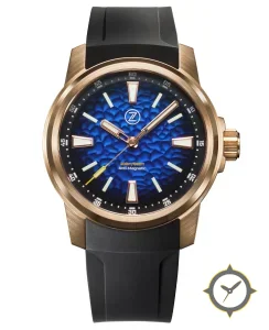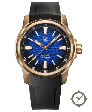Eine Taucheruhr-Uhr mit einem 33mm Gehäuse im Vintage-Stil gefertigt aus Bronze mit einem Zifferblatt in blau und einer besonderen "textured, hammered/embossed (scales-like)"-Oberfläche.