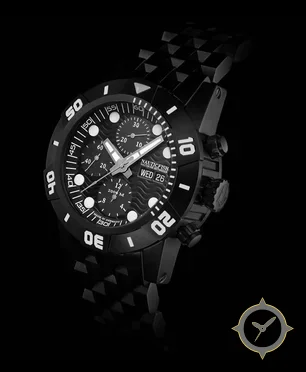 Eine Taucheruhr-Uhr mit einem markanten 49.5mm Auftritt am Handgelenk, gefertigt aus Beschichtung mit einem Zifferblatt in schwarz und einer besonderen "wave pattern (textured)"-Oberfläche.
