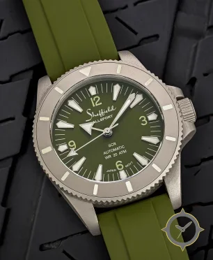 Eine Taucheruhr-Uhr gefertigt aus Titan mit einem Zifferblatt in grün und einer besonderen "matte"-Oberfläche.