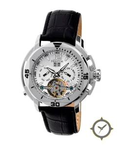 Eine Skelett-Uhr mit einem markanten 52.5mm Auftritt am Handgelenk, gefertigt aus Edelstahl mit einem Zifferblatt in weiß und einer besonderen "guilloche"-Oberfläche.