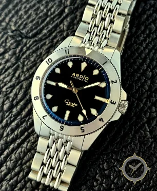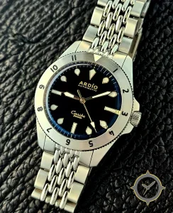 Eine Taucheruhr-Uhr mit einem 32.5mm Gehäuse im Vintage-Stil gefertigt aus Edelstahl mit einem Zifferblatt in schwarz und einer besonderen "glossy/lacquer"-Oberfläche.