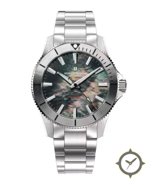 Eine Taucheruhr-Uhr mit einem markanten 43.5mm Auftritt am Handgelenk, gefertigt aus Edelstahl mit einem Zifferblatt in schwarz und einer besonderen "mother-of-pearl (iridescent)"-Oberfläche.