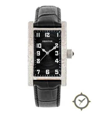 Eine Dress-Uhr mit einem 30.5mm Gehäuse im Vintage-Stil gefertigt aus Edelstahl mit einem Zifferblatt in schwarz und einer besonderen "guilloche sunburst"-Oberfläche.
