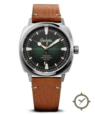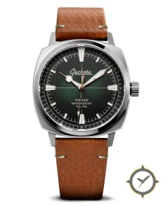 Eine Field-Uhr mit einem 34.5mm Gehäuse im Vintage-Stil gefertigt aus Edelstahl mit einem Zifferblatt in grün und einer besonderen "fumé sunburst"-Oberfläche.