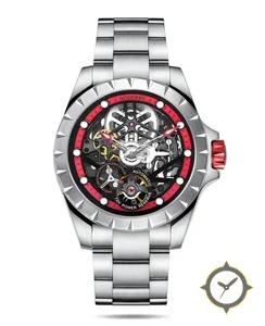 Eine Skelett-Uhr mit einem vielseitigen 40.5mm Gehäuse, das an fast jedes Handgelenk passt, gefertigt aus Edelstahl mit einem Zifferblatt in schwarz und einer besonderen "open-work (exposed movement)"-Oberfläche und einer praktischen Gangreserveanzeige.