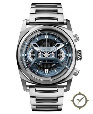 Eine Skelett-Uhr mit einem markanten 45.5mm Auftritt am Handgelenk, gefertigt aus Edelstahl mit einem Zifferblatt in blau und einer besonderen "skeletonized, open-worked with visible movement"-Oberfläche.