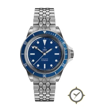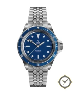 Eine Taucheruhr-Uhr mit einem 35.5mm Gehäuse im Vintage-Stil gefertigt aus Edelstahl mit einem Zifferblatt in blau und einer besonderen "matte"-Oberfläche.