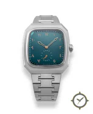 Eine Sport-Uhr mit einem markanten 42mm Auftritt am Handgelenk, gefertigt aus Edelstahl mit einem Zifferblatt in türkis und einer besonderen "vertical brushed"-Oberfläche.