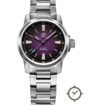 Eine Sport-Uhr mit einem vielseitigen 38.5mm Gehäuse, das an fast jedes Handgelenk passt, gefertigt aus Edelstahl mit einem Zifferblatt in lila und einer besonderen "sparkle/grained, sunburst gradient toward black outer ring"-Oberfläche.