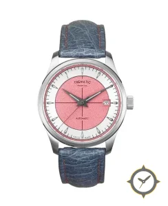 Eine Dress-Uhr mit einem markanten 43mm Auftritt am Handgelenk, gefertigt aus Edelstahl mit einem Zifferblatt in karmesinrot und einer besonderen "frosted/grainy metallic"-Oberfläche.