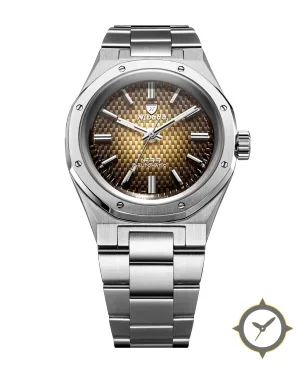 Eine Sport-Uhr mit einem vielseitigen 38.5mm Gehäuse, das an fast jedes Handgelenk passt, gefertigt aus Edelstahl mit einem Zifferblatt in braun und einer besonderen "woven/carbon-fiber texture with fumé gradient"-Oberfläche.