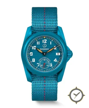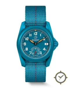 Eine Field-Uhr mit einem markanten 43mm Auftritt am Handgelenk, gefertigt aus Beschichtung mit einem Zifferblatt in türkis und einer besonderen "honeycomb"-Oberfläche.