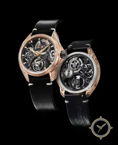 Eine Skelett-Uhr gefertigt aus Gold mit einem Zifferblatt in schwarz und einer besonderen "openworked/skeleton"-Oberfläche.