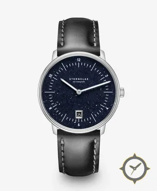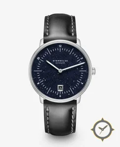 Eine Minimalistisch-Uhr mit einem markanten 44.5mm Auftritt am Handgelenk, gefertigt aus Edelstahl mit einem Zifferblatt in marineblau und einer besonderen "sparkling/aventurine (starfield)"-Oberfläche.