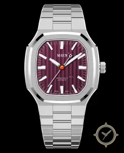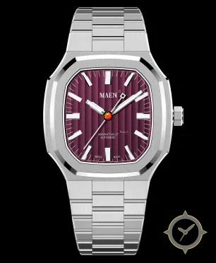 Eine Luxus-Uhr mit einem vielseitigen 39mm Gehäuse, das an fast jedes Handgelenk passt, gefertigt aus Edelstahl mit einem Zifferblatt in karmesinrot und einer besonderen "vertical teak stripes"-Oberfläche.