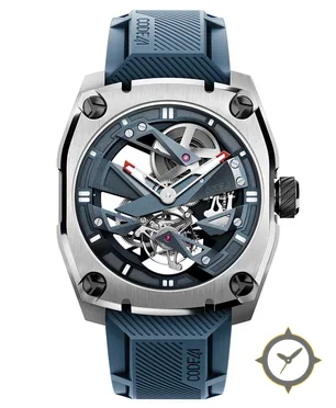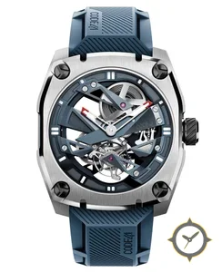 Eine Skelett-Uhr gefertigt aus Edelstahl mit einem Zifferblatt in blau und einer besonderen "skeletonized/open-worked"-Oberfläche.