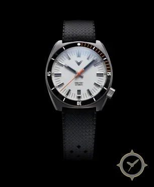 Eine Taucheruhr-Uhr mit einem markanten 42.5mm Auftritt am Handgelenk, gefertigt aus Edelstahl mit einem Zifferblatt in weiß und einer besonderen "matte"-Oberfläche.