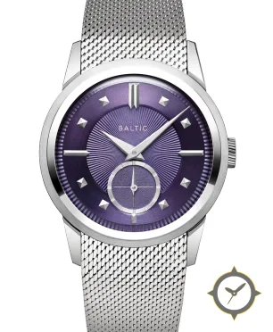 Eine Dress-Uhr mit einem 31mm Gehäuse im Vintage-Stil gefertigt aus Edelstahl mit einem Zifferblatt in lila und einer besonderen "sunburst guilloché with radial engraved lines and a slightly brushed outer ring"-Oberfläche.