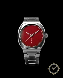 Eine Sport-Uhr mit einem vielseitigen 38.5mm Gehäuse, das an fast jedes Handgelenk passt, gefertigt aus Edelstahl mit einem Zifferblatt in rot und einer besonderen "vertical brushed"-Oberfläche.