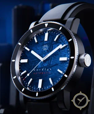 Eine Taucheruhr-Uhr mit einem markanten 42mm Auftritt am Handgelenk, gefertigt aus Edelstahl mit einem Zifferblatt in blau und einer besonderen "meteorite-like textured finish with cross-hatched striations"-Oberfläche.