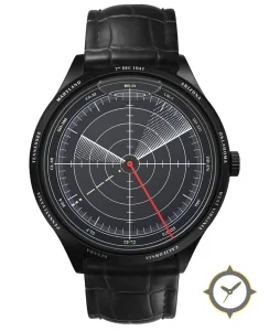 Eine Luftfahrt-Uhr mit einem 37.5mm Gehäuse im Vintage-Stil gefertigt aus Beschichtung mit einem Zifferblatt in schwarz und einer besonderen "printed"-Oberfläche.
