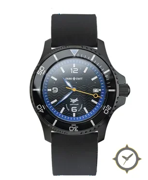 Eine Taucheruhr-Uhr mit einem 36.5mm Gehäuse im Vintage-Stil gefertigt aus Beschichtung mit einem Zifferblatt in schwarz und einer besonderen "textured-wave"-Oberfläche.